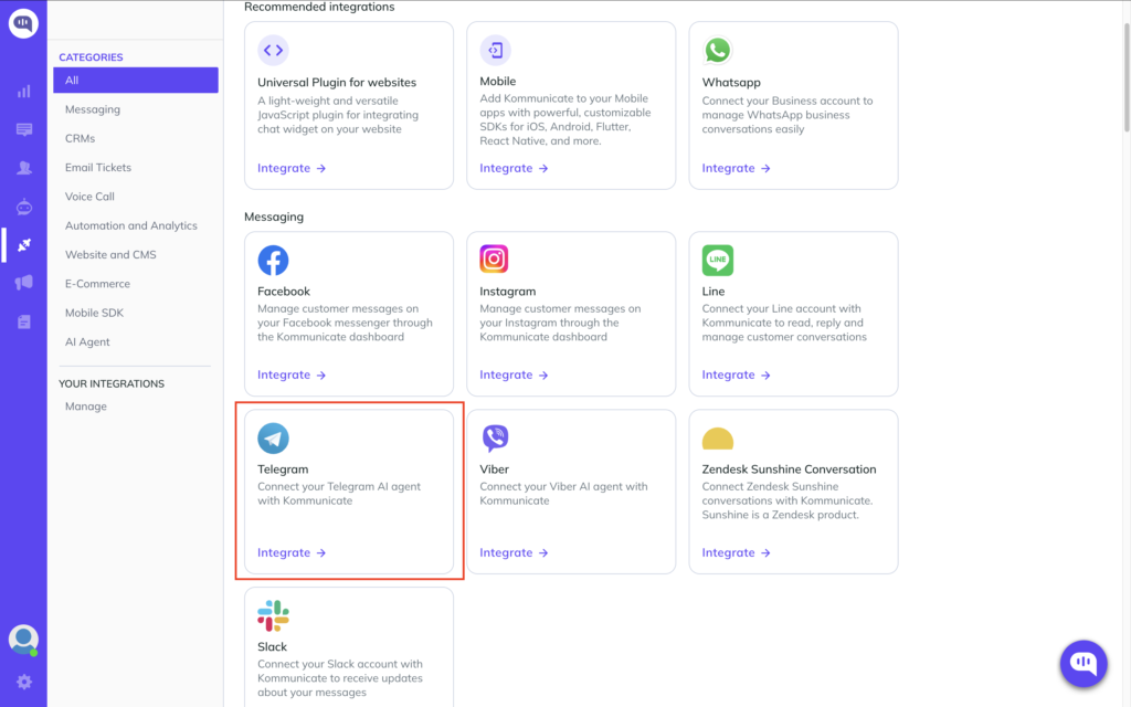 Without further ado, here are the steps involved in integrating Telegram with Kommunicate.