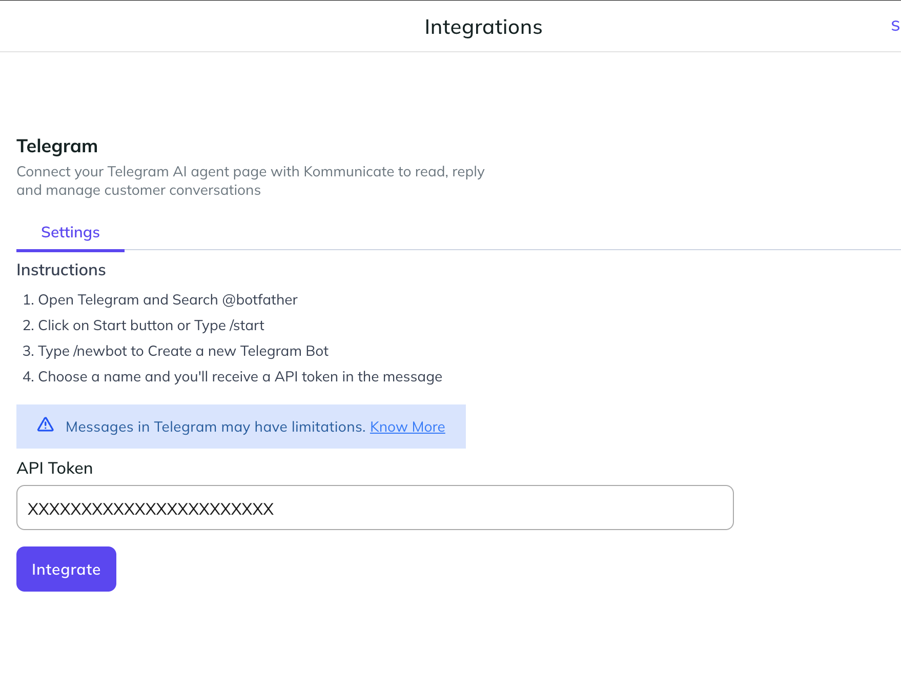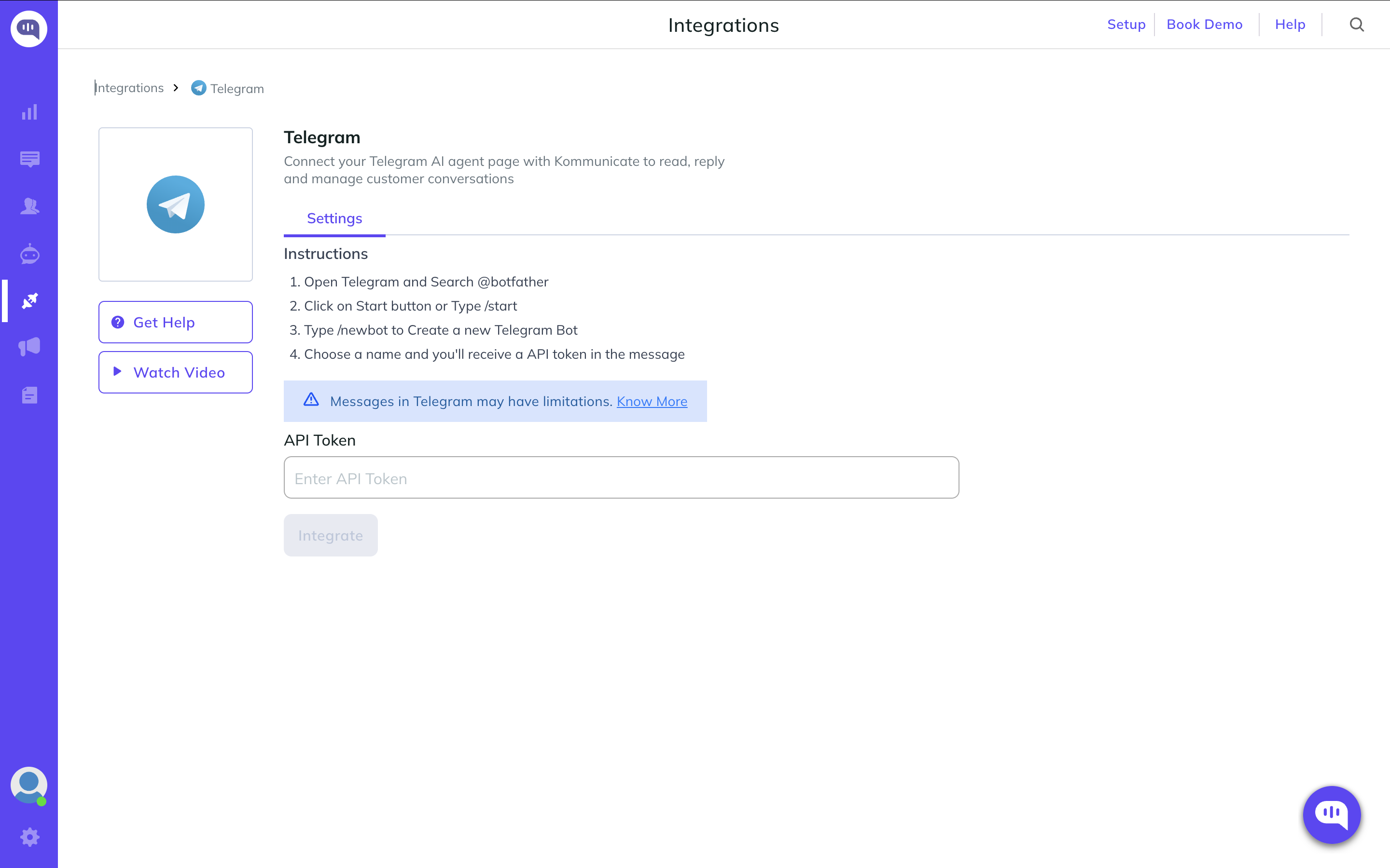 Step 3: Paste the API key into the Telegram integration card from the Kommunicate Dashboard and click the “Integrate” button.