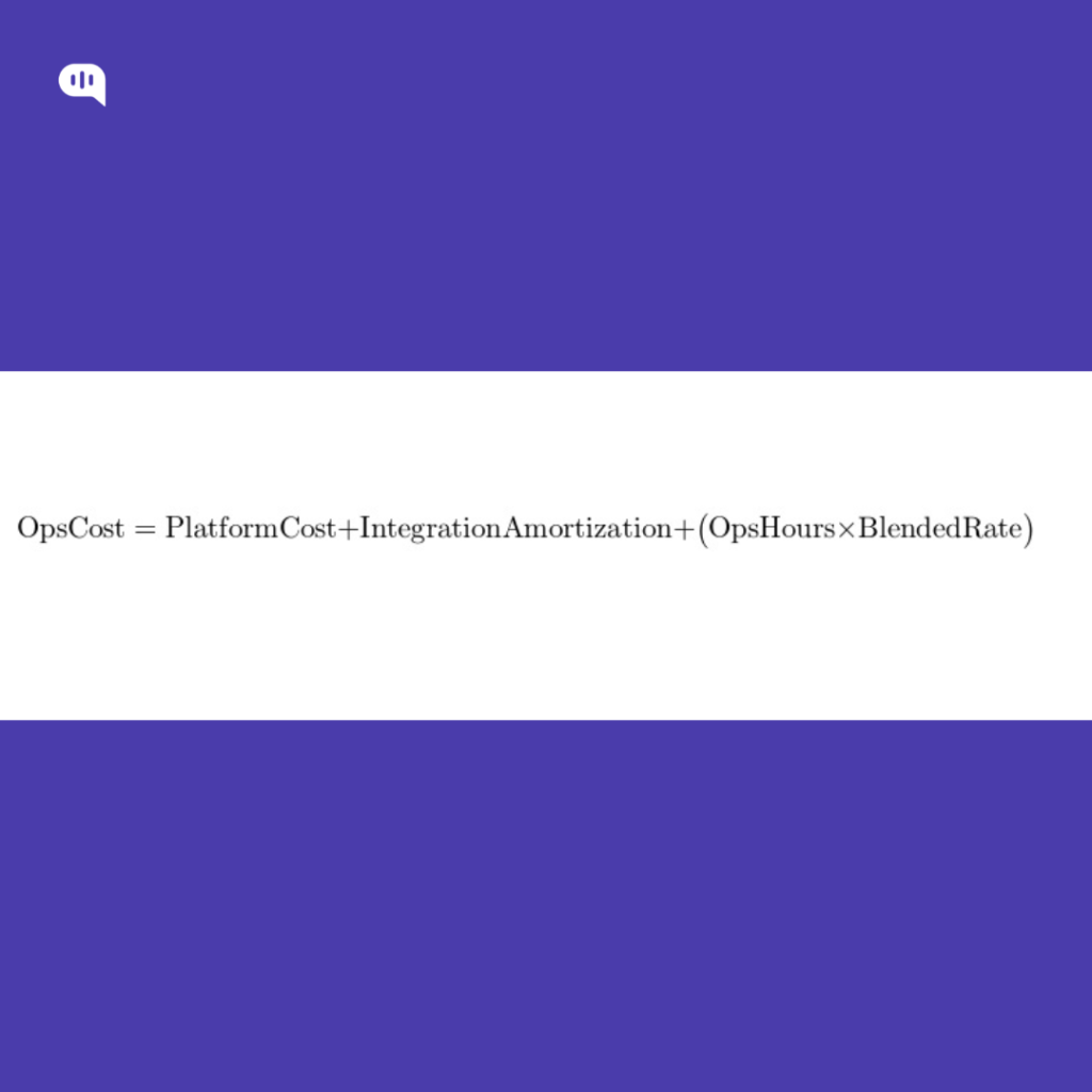 Ops costs = QA sampling, knowledge upkeep, routing tuning (monthly hours × blended rate)