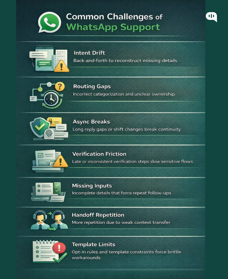 WhatsApp support can feel frictionless for customers, but it introduces operational constraints that many teams underestimate. The most common failures are rarely about the channel itself. They come from weak context capture, inconsistent routing, and workflows that do not account for asynchronous behavior, verification, and handoffs.