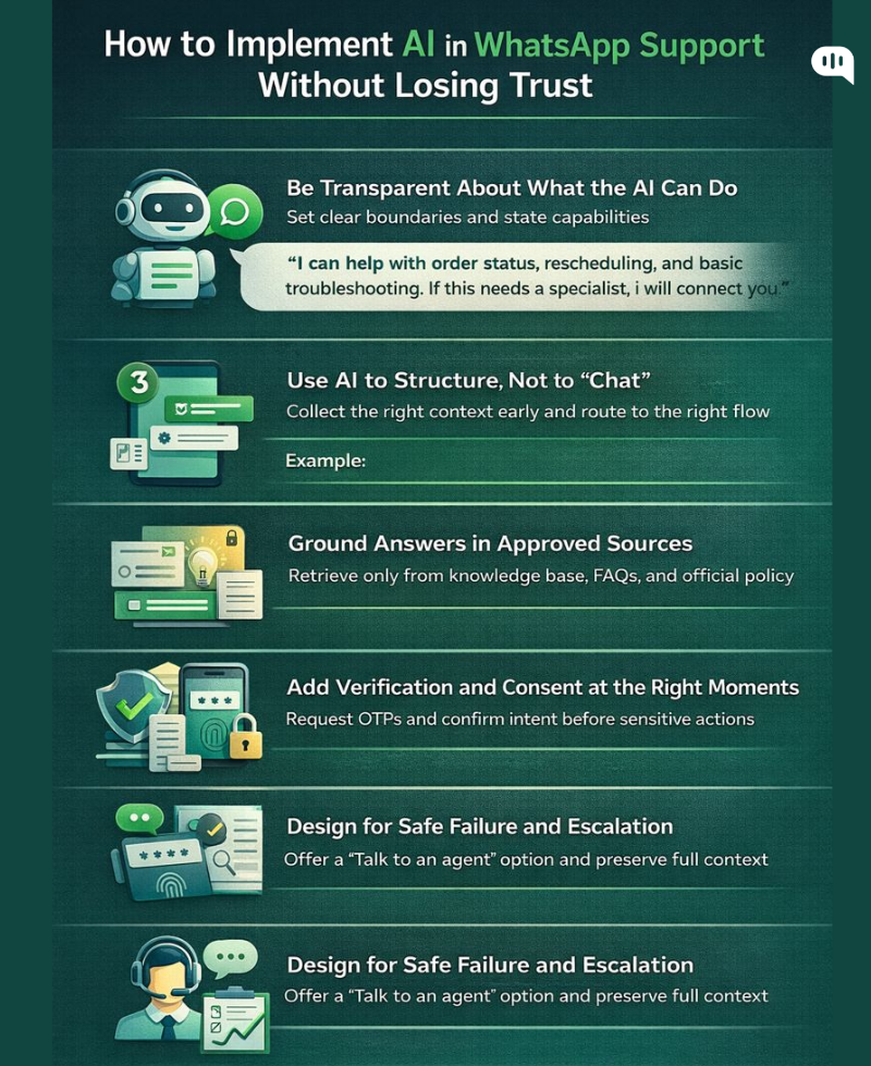 AI fits best in WhatsApp support where intents are predictable, context can be captured structurally, and answers can be grounded in approved information. Humans should take ownership when exceptions appear, risk increases, or emotions rise. When you place AI across intake, structured resolution, grounded knowledge, agent acceleration, and follow-up, WhatsApp becomes faster without feeling automated in a way that erodes trust.