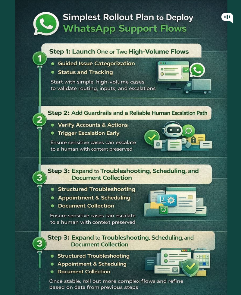 WhatsApp support flows work best when you roll them out in a controlled sequence, starting with the highest-volume, lowest-risk intents. A simple rollout plan reduces operational disruption, prevents trust-breaking failures, and gives your team clear feedback loops as you expand automation.